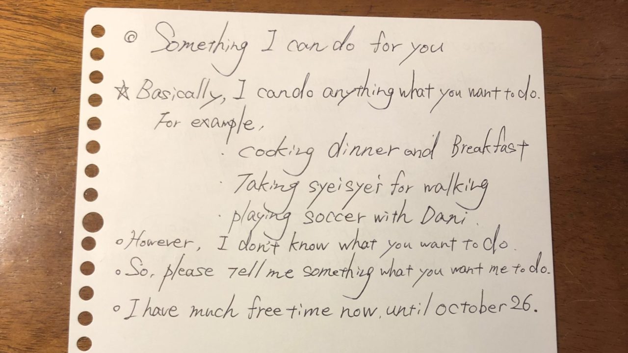 もともと「1週間はゲストとして何もしなくていい。それ以降もお金は一切いらないから何が出来るか教えて。でも無理はしないで欲しい。」と言われていたので、早速ご家族に色々と提案してみました。